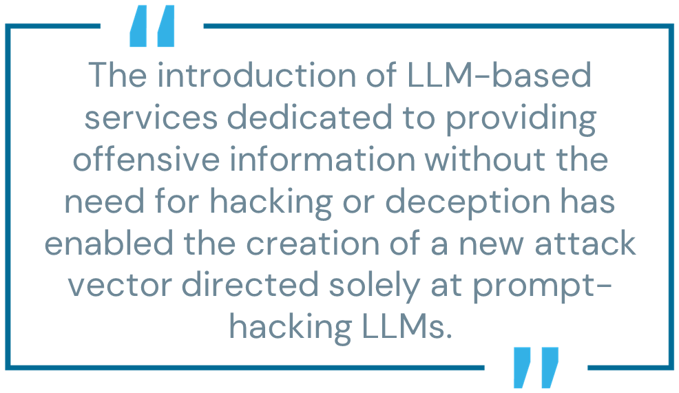 The introduction of LLM-based services dedicated to providing offensive information without the need for hacking or deception has enabled the creation of a new attack vector directed solely at prompt-hacking LLMs. This new type of cyberattack exploits LLM vulnerabilities by creating specific prompt inputs to manipulate the base behavior and elicit prohibited responses. This attack vector has three distinct techniques: