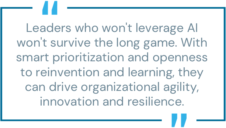 Blog pull quote: "Leaders who won't leverage AI won't survive the long game. With smart prioritization and openness to reinvention and learning, they can drive organizational agility, innovation and resilience."