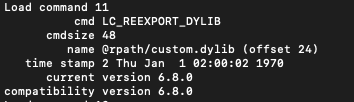 Similarly, we can use the command otool -l dummy | grep LC_LOAD_DYLIB -A5 to check if any dylibs are loaded from @rpath (Figure 5).