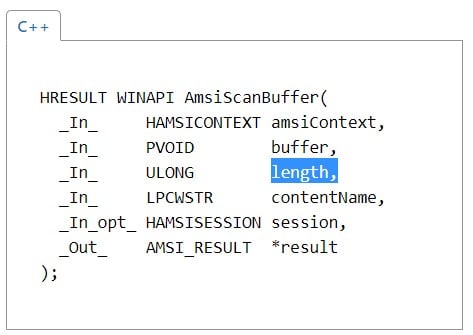 Then zeroing the parameter ULONG length of the scanned buffer (using xor edi,edi instruction injected at offset 0x1B) thus breaking the AMSI interface only in the process where the C# DLL was loaded (“and bypassing AMSI”).