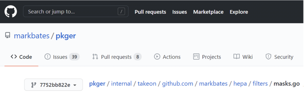 This function’s name is github.com.markbates.pkger.internal.takeon.github.com.markbates.hepa.filters, which means: “a function located in filters file in hepa package written by markbates and uploaded to Github, but actually embedded into pkger package written by markbates and uploaded to Github as well.”
