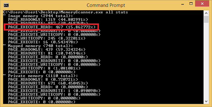 In order to give the clearest possible picture of what constitutes legitimate memory allocation, I wrote a memory scanner (the PoC for which can be found on Github) which uses the characteristics of the MEMORY_BASIC_INFORMATION structure returned by KERNEL32.DLL!VirtualQuery to statistically calculate the most common permission attributes of each of the three aforementioned memory types across all accessible processes. In the screenshot below, I’ve executed this scanner on an unadulterated Windows 8 VM.