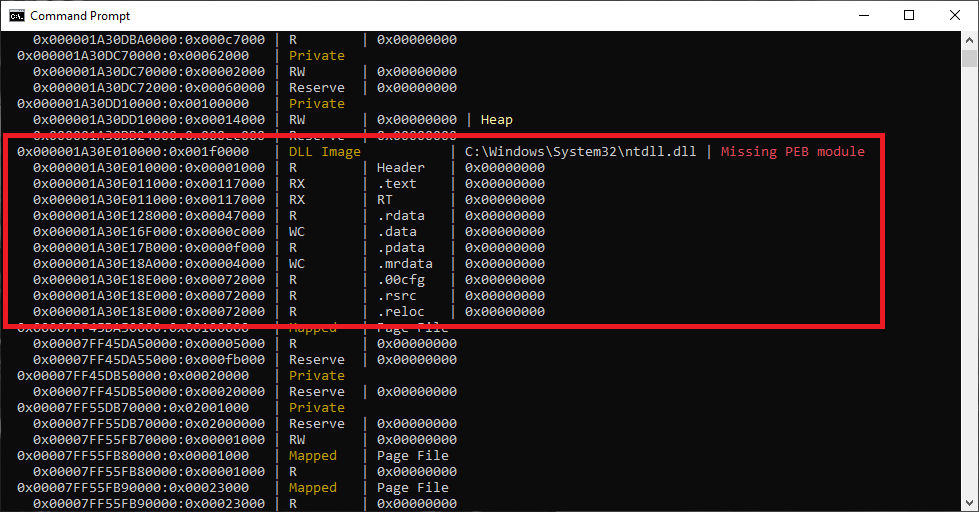 Notably, the fact that pe-sieve does not mark unmodified manual image section mappings as malicious demonstrates a high level of sophistication in regards to false positives. As was discussed in part two of this series, there are many existing phenomena in Windows that result in image mapping with no corresponding PEB loaded modules list entry, such as metadata files.