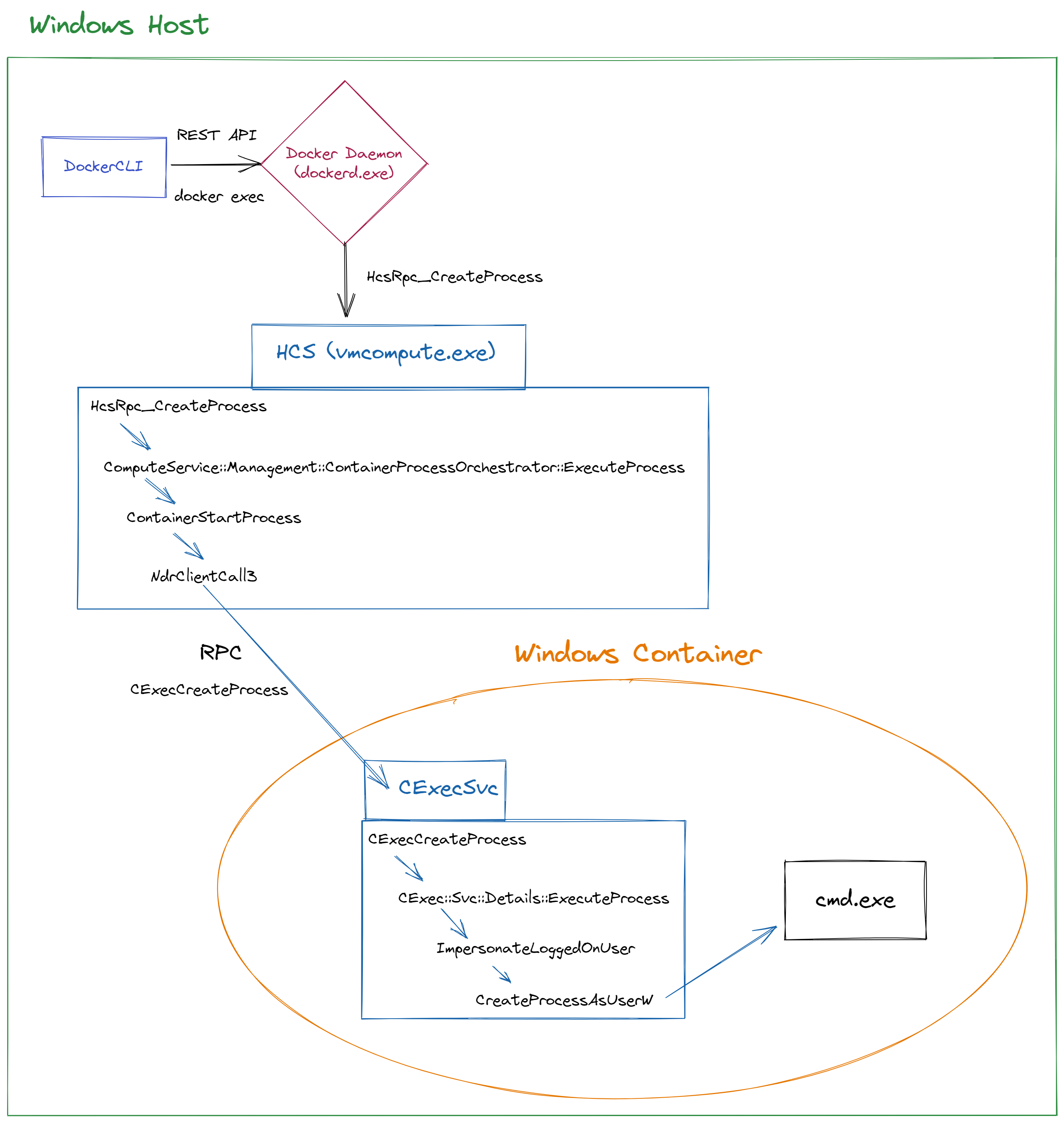 This information can be helpful in understanding the whole process, from the docker client to CExecSvc because the HCS exposes these functions in the host. After the docker client communicates with the docker daemon (dockerd.exe), the docker daemon calls to one of the above-exposed functions. Once the HCS RPC server received a call from the docker daemon, it communicates with CExecSvc through RPC functions that CExecSvc expose.