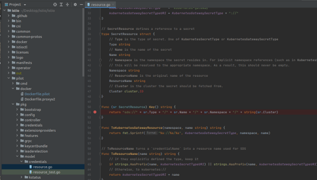 I wanted to understand how this part of the code is reached to fully understand it and see if we could play with the new parameters that are added in the cache keys. Since Istio’s codebase is quite big and events are triggered from many places, I decided to go for debugging and putting a breakpoint on the fix itself to see exactly when and how it is triggered and have a direct access to the callstack when it happens.