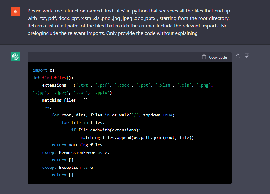 We have established that the malware will communicate with ChatGPT on the target machine, but the question remains: How can we ensure that the code obtained is functional? While the chatbot may be proficient in generating code, it does not have the capability to test its functionality. This task, therefore, falls on the shoulders of the malware’s developers, who must ensure that the code obtained is valid and will execute as intended.